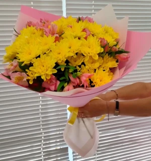 Ощущая нежное прикосновение первых лучей утреннего солнца, этот букет словно окутывает своим теплом и нежностью. Желтые воздушные хризантемы притягиваются к свету, создавая атмосферу радости и оптимизма. Нежные альстромерии, словно мягкие облака на небе, добавляют воздушности и изысканности композиции. Букет, оформленный в крафтовую упаковку, придает ему естественность и некую загадочность. Испытайте чарующую магию этого букета и подарите его любимому человеку, чтобы принести в его жизнь тепло и счастье.
